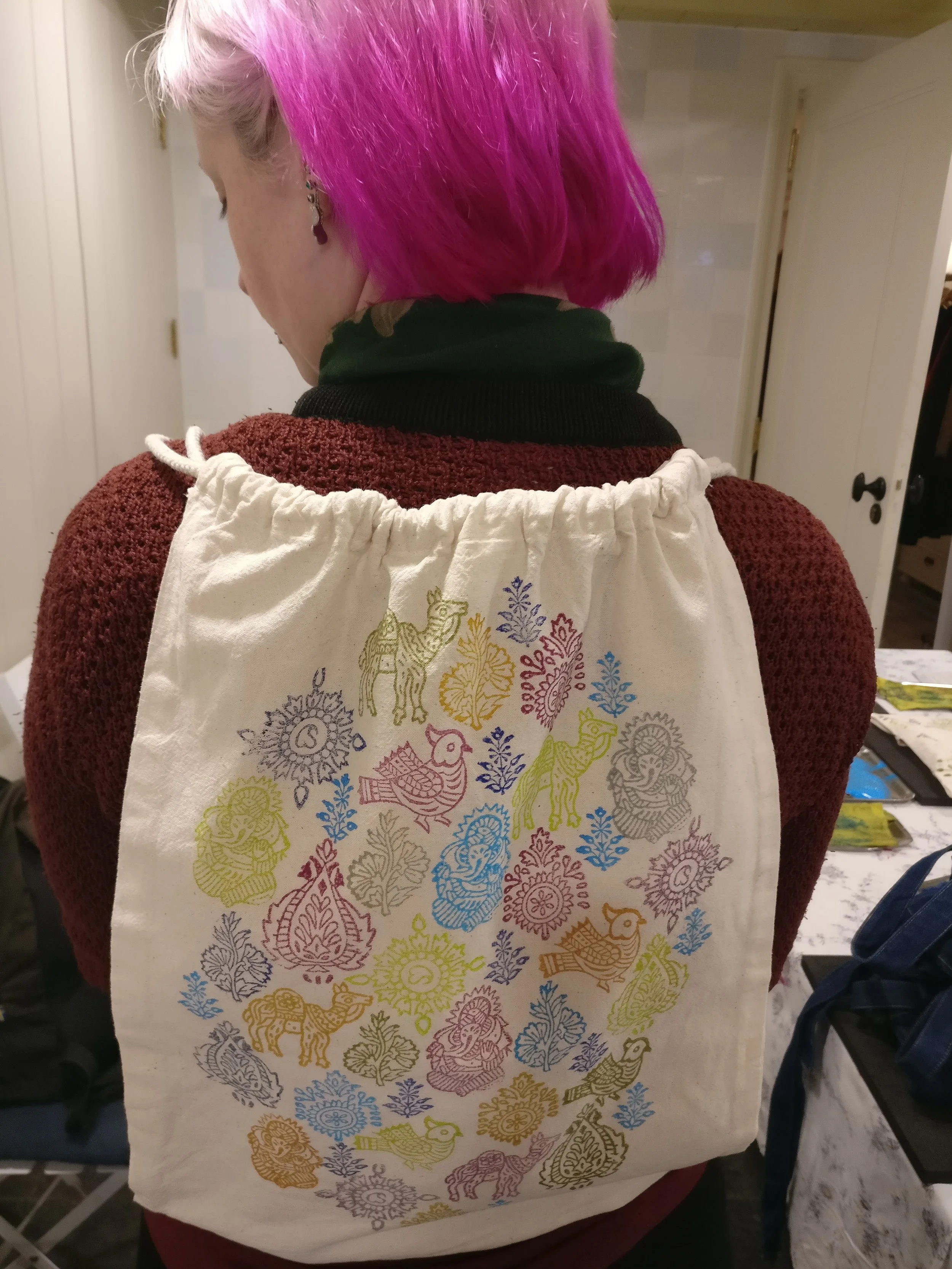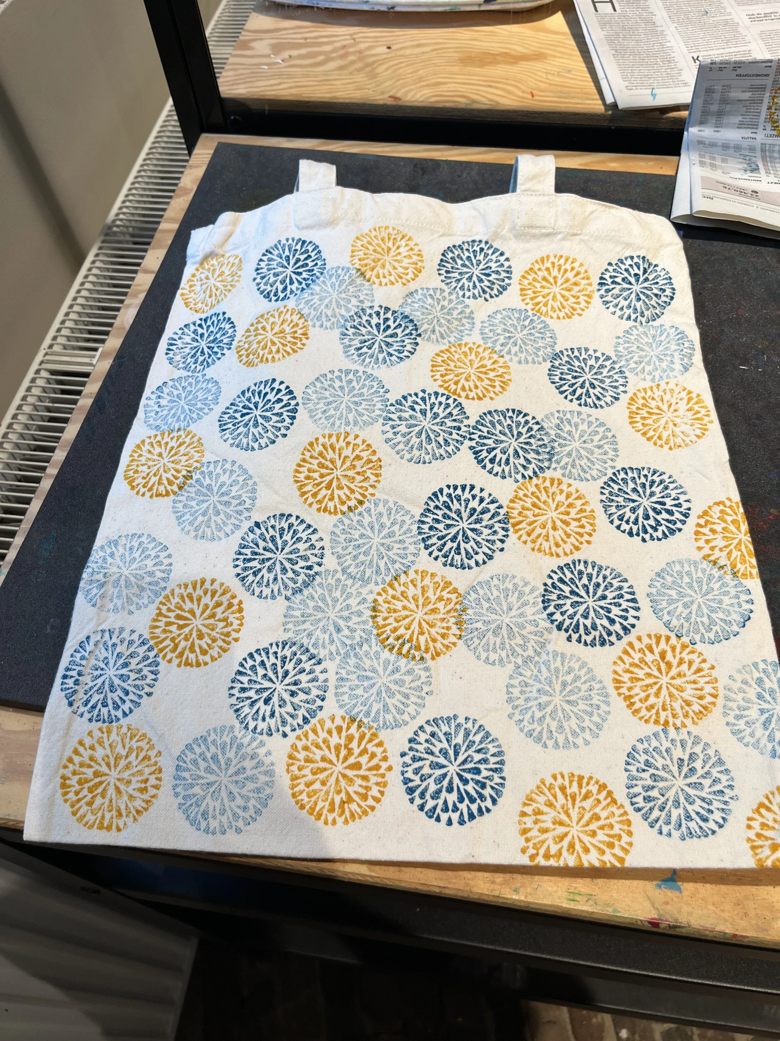 U leert drukken, maakt een ontwerp op proefpapier en werkt deze uit op een katoenen zakje.